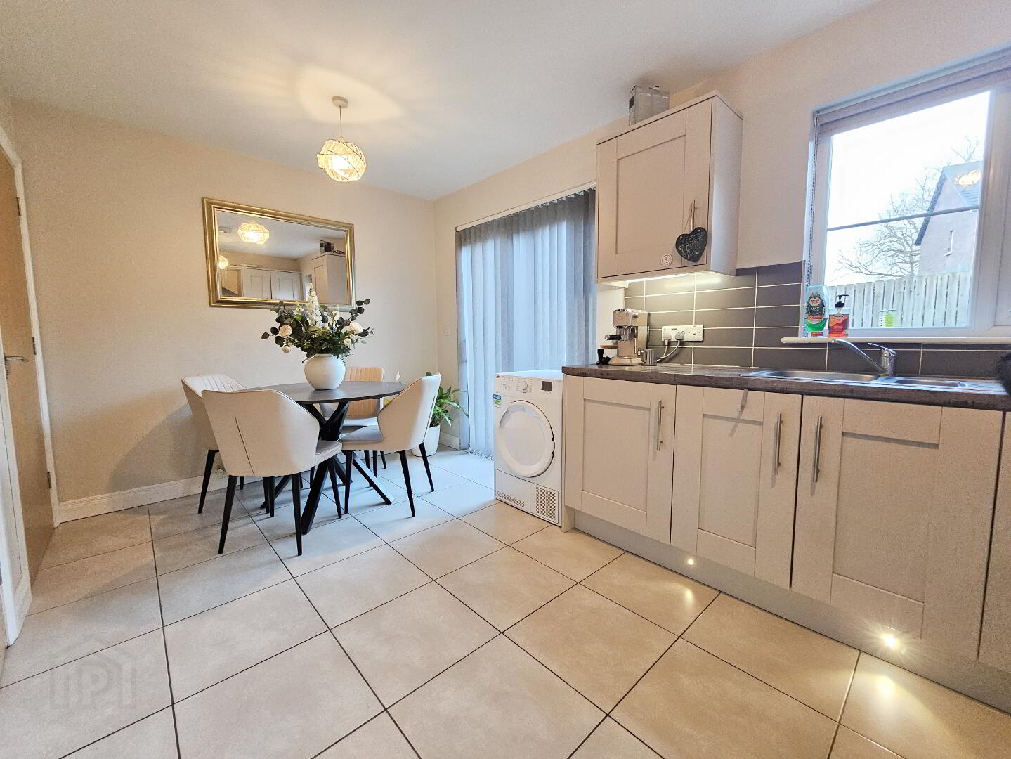 Open plan kitchen and dining area with integrated appliances